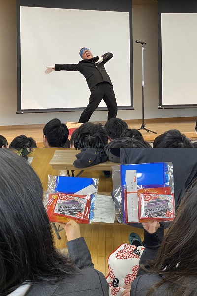 これは,1期生以来毎年行われている本校エンタープライジング科伝統の取組であり,余分な緊張を解きほぐし,全員が一体感を持って堂々と試験に乗り込んでいけるようにするために行っているもので,今回で15回目となります。毎年,担当されてきた先生方の持ち味を生かし,趣向を凝らしたメッセージを伝えています。