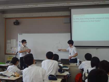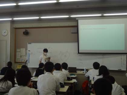 9/9(水)1−1の英語授業に生物の教員がゲスト出演しました。英語の教科書の題材が「うまみ」を扱っており,英語教員が通常のレッスンを行った後,専門用語のキーワードについて本校生物の教員が英語で説明を行いました。専門的な見地からの解説で,より内容理解が深まったのではないでしょうか。英語の授業は,基本オールイングリッシュですが,日本語英語も少し交じり,和やかなムードで授業が行われていました。