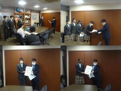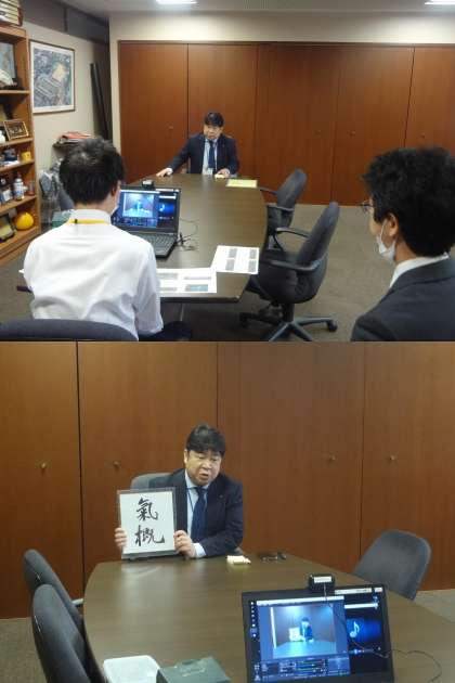 引き続き,前期に活躍した生徒の表彰を行い,陸上部の生徒が放送拠点となった校長室で学校長から伝達表彰を受けました。今年は全国インターハイが中止となり,地域別の代替大会となりましたが,選手諸君は精一杯頑張り,成果を残してくれました。表彰の度に各フロアからは大きな拍手が沸き起こっていました。