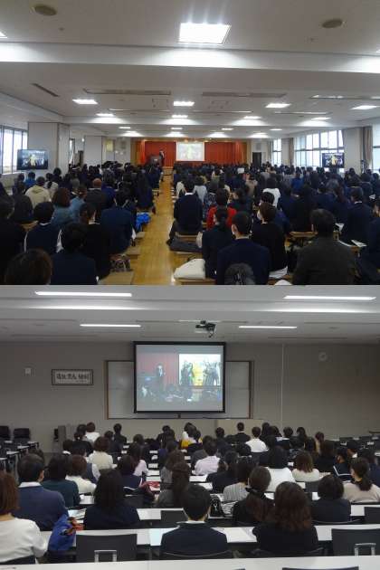 11月7日(土)第2回学校説明会を実施いたしました。新型コロナウイルス感染拡大防止の観点から,午前・午後の2回に分けての開催です。また,メイン会場のメモリアルホールでは,会場の密を避けるため,4人掛けの長椅子に1家族で座っていただき,サブ会場の大講義室でも座席間隔をとったうえで会場の様子を同時中継いたしました。