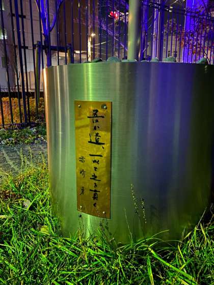 オブジェの台座正面には,赤崎先生ご自身が揮毫されました『吾が道,一以て之を貫く』を刻んだ銘板が飾られており,今も毎晩“理知の光”“英知の輝き”を放っています。