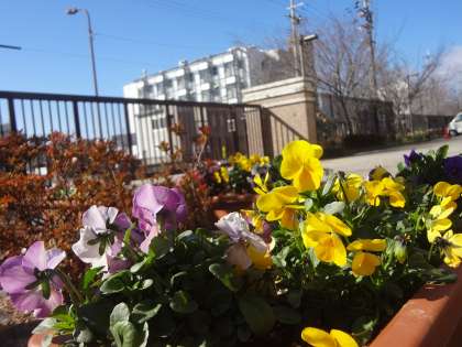 春は着々と近づいており,玄関付近では,プランターや植込みで花が咲いています。前期選抜の合格発表は,2/24(水)14:00です。
