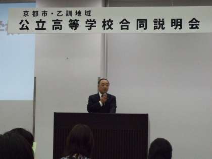 (左:校長からの全体説明 右:西京高校ブース)
