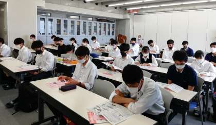 例年,消防署から署員の方にご来校いただき,100人程で実施している講習会ですが,今年はコロナの影響で定員を30人に設け,本校養護教諭による講習会となりました。座学では熱中症対応や心肺蘇生法,AEDの使い方等を学び,訓練用の人形とAEDを使って心肺蘇生法を練習しました。実際に胸骨圧迫を行ってみると,かなり体力がいることが分かった様子です。座学ではメモを取っている様子も見られました。