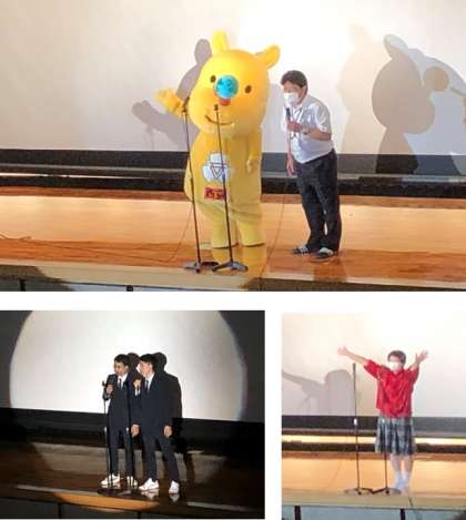 〔写真〕上:開会式の様子(岩佐校長とさいきょんの登場)