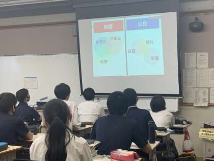 1年生は2年次に向けて,自然科学コースと社会科学コースの選択,さらに各コース内での科目選択をすることになります。アッセンブリでは教務部,地歴公民,理科の教科担当から科目選択の注意点に関する説明がありました。科目選択は受験科目に関わる大事な選択のため,生徒はメモを取りながら話を聞いていました。