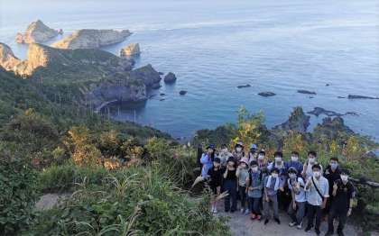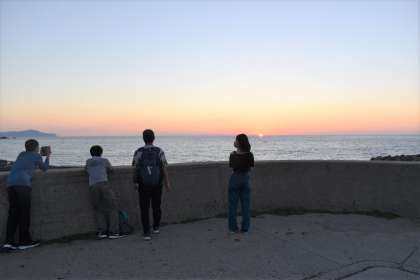 伊丹空港から飛行機で隠岐の島町へ移動し,1日目は道後地域で活動をしました。林道散策ではジオパークガイドの方の案内で島の自然に触れ,その後は海の近くへ移動し,日本海に沈む夕日を眺めました。水平線に沈んでいく夕日は圧巻でした。