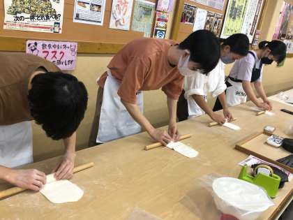 中:中野うどん学校でのうどん作り体験の様子