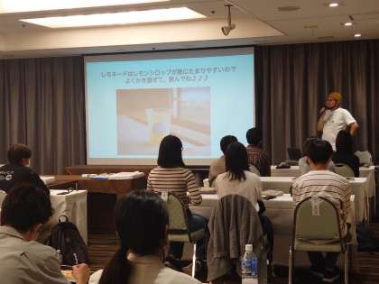 その後はホテルにもどり、愛媛県の岩城島より「わらしべ。」代表の岡信太郎様にお越しいただき、ワークショップを行いました。ここでは企画力の根底にある考え方を成長させるためのグループワークを行いました。また今回は特別に、「わらしべ。」様が流通を手掛けておられる「岩城島産のレモンを使った3つ星レモネード」を振る舞っていただきました!美味しいジュースとともに、充実したワークショップを行うことができました。岡様、本当にありがとうございました!