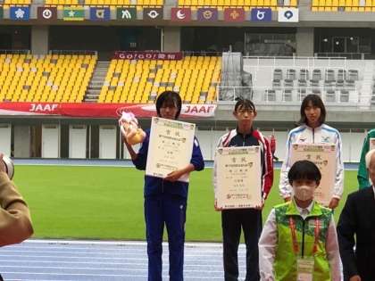 大会5日間の結果、見事、少年A女子300mにおいて優勝することができました!これで児島さんはインターハイと合わせると、200m、300m、400mの3種目で日本一のタイトルを手にしたことになります。また、男女混合4×400mリレーでも2走を務めて第3位に入賞し、京都チームに貢献することができ、笑顔で京都に帰ってきて結果報告をしてくれました。これからも世界を目指してますますの活躍を期待しています!