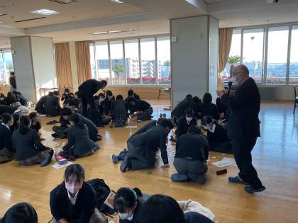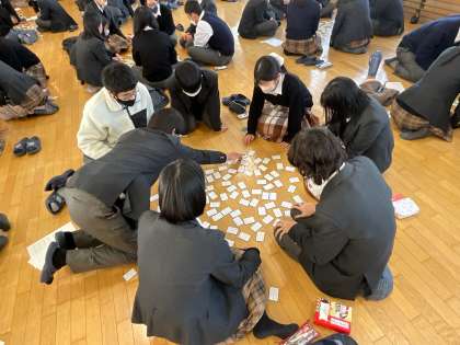 2年担任団によって読み上げられる和歌を聞き、どの生徒も真剣になって札を取り合っていました。どのグループも非常に和気あいあいとカルタ取りに取り組んでいました。また、競技終了後には結果が集計され、上位の生徒とクラスは学年団から表彰しました。