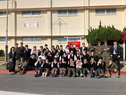 米軍基地チームはまずクバサキ高校を訪問しました。体育や音楽などの授業を相手校の生徒と一緒に受け、ランチを共にしました。異なる文化、言語の中で同じ年代の高校生たちと交流し、たくさんの刺激を受けました。午後はキャンプ・キンザーを訪れ、現役の海兵隊員と交流しました。海兵隊員になった理由から普段の生活についてなど幅広く質問し、一つ一つ丁寧に答えて頂きました。1日通して英語での活動となりましたが、積極的に交流を図ろうとする姿が印象的でした。