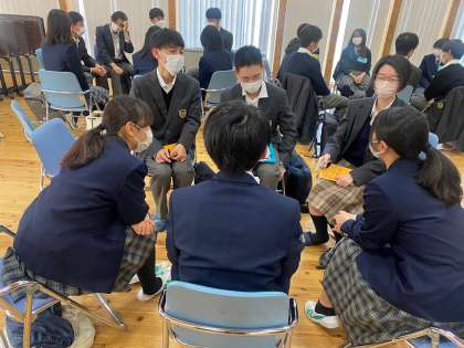 まず訪れたのは、広島県立大崎海星高校です。1年生同士で交流しました。緊張していましたが、すぐに打ち解け、違いや共通点をおもしろがっていました。
