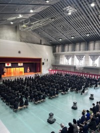 第1部の全大会では、アリーナに高校2年生、1年生、中学生が集合し、校長先生の挨拶に続き、FW委員からの趣旨説明や質疑応答がありました。