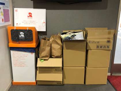 本校が京都市環境政策局地球温暖化対策室と連携して取り組んでいる「使用済み衣服の回収&循環プロジェクト『RELEASE⇔CATCH』」ですが、回収ボックスに入りきらず、急遽横に箱を置いて対応しておりました。