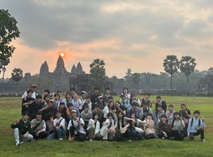 午前中は、アンコールトム→バイヨン寺院→象のテラス・ライ王のテラス→タプロムの順に遺跡巡りをしました。ガイドさんの丁寧な説明に、みんな興味津々な様子でした。昼食はクメール料理を堪能し、午後からはアンコールワット観光です。遺跡の歴史や壁画の説明などを受けながら見学しました。第3回廊から見渡す景色は特別なものとなりました。最後は、小山を登り高台にあるプノンバケン寺院から夕日鑑賞をしました。今日一日たくさん歩いた疲れも吹き飛ぶような時間となりました。