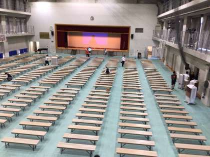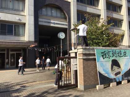 西京祭前日ということで、校内の装飾やアリーナの椅子並べなどを行っています。