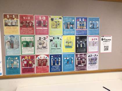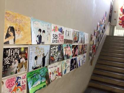 1階階段の壁には各クラスのポスターを掲示しています。また4階廊下ではクラスTシャツデザインコンテストを行っています。各クラスが工夫を凝らしたポスターやTシャツデザインを是非ご覧ください!