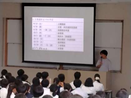 その後、池田学年主任から文理選択と、夏休みを踏まえた今後の目標についてお話いただきました。文理選択は、自分の将来と適性と両方の視点を踏まえたうえで行ってほしい、どちらかに偏った選択にならないように注意してほしいとのことでした。また、文理選択を行う際の判断材料ともなる土曜講座、前期期末考査、模試のスケジュールを確認したのち、夏休みまでを踏まえて、習慣化できることは引き続き習慣として続けていき、できない(できなかった)自分を受け入れて改善していこうと励ましの言葉もいただきました。