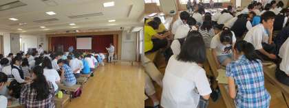 ネイティブの先生方4人全員出動のもと,まずはランダムに組んだ1対1のペアで,日本語(例えば「はじめまして」というあいさつの言葉等)を西京の生徒が英語に直し,それを聞いた星港学校の生徒が中国語に直す,といったゲームでアイスブレイクです。
