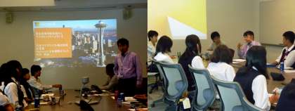 はじめに日本マイクロソフト株式会社・日本戦略オフィス所長の中村武由様からマイクロソフト社の概要をうかがった後,日本からこちらに来てパワーポイントの開発をされている方とアウトルックの開発をされている方のお二人をまじえてフリートークでお話をさせていただきました。社員の方々の「やりたいことをやってつまずいたときに何が足りないか考えることが大事である」「はじめから思い通りにやれることはない。経験が武器になる」という言葉や,「マイクロソフト社の中では異動を自由にすることができ,社員それぞれが常にチャレンジし続けている」というお話しに大変刺激を受けていました。