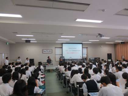 西京祭直前の準備期間中ということで,大講義室の正面や後ろに演奏機材がセッティングされ,いつもとは違うしつらえの中で,進路指導部長や3年学年主任から注意事項や間違いやすいポイント(受験料振込時に保護者名で手続きをしてしまう,等),について説明がありました。本日下書きを提出し,来週末には学級担任に志願票提出です。間違いが許されない手続きですので,どの生徒も真剣に聞き入っていました。