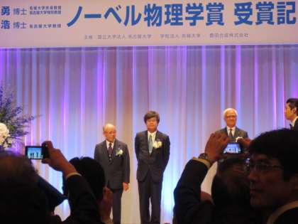 主催者である名古屋大学・名城大学の関係者はもとより、文部科学省や経済産業省、愛知県知事、名古屋市長をはじめとする政界の代表者や、青色LEDの実用化に成功した豊田合成株式会社をはじめ経済界の代表者など1,000人を超える参加者があり、多数の報道陣も取材に駆けつけ、盛大にお二人の偉業をたたえる式典となりました。また、スウェーデン王室からも代表の方がお祝いに来られるなど、この業績が国際的なレベルでも高い評価をされていることが実感されました。