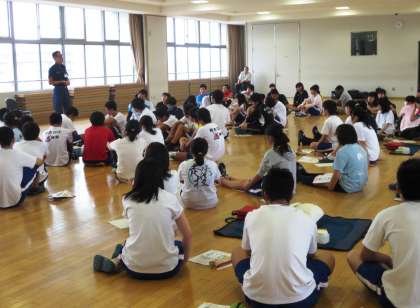 今回は,特に生命を救うために必要な,AEDの使用方法を含めた心肺蘇生法,止血法,窒息が疑われる際の気道異物除去法を学びました。まず全体で応急手当に関する講義を受け,その後7体の訓練用人形を使い,心臓マッサージや人工呼吸,AEDの使い方等,ひとりひとり順番に心肺蘇生法を練習しました。