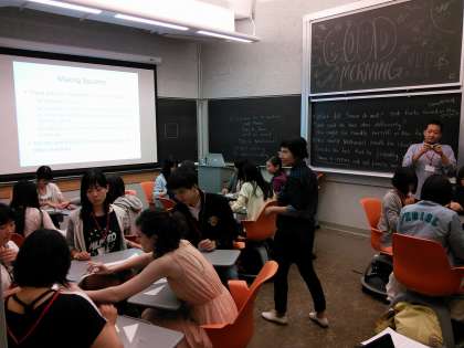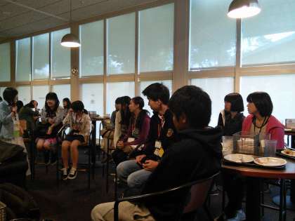 イブニングセッションの始めは,「尊敬する人物」についてです。ルーズベルト大統領やスティーブ・ジョブズをはじめ,その他海外では知られていない人物や家族について発表する西京生に大学生も興味深く聞き入っていました。次に,「Leadership,Teamwork,Success」についての議論です。あるケースを想定して,各グループでリーダーに必要なことについて議論をします。その人物は何ができたか,何をすべきだったか,リーダーシップを育てるためにはどうすればよいか,まだ高校生である西京生には非常に難しい議題ではあるのですが,積極的に意見交換を行い,それぞれの考えを発表しました。最後は,チームワークに必要な資質のリストをもとに自分はどれくらい満たせているのかを,プリントを読み理解することで考えました。実際に作業をやってみることで,チームワークのために話すことややり取りをすることの大切さに気づけました。全体を通して,全員でテーマについて考えるという姿勢が始終見受けられ,短期間ながら生徒たちの成長が実感されました。