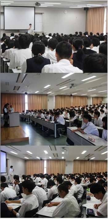 まず,学年主任の富永先生から「学習講座」を受講するに当たっての注意や今後の学習の進め方,心構え等についての注意です。厳しい話もあり,生徒たちは忙しさを言い訳にせず,自らの課題に取り組もうと熱心に聴いていました。
