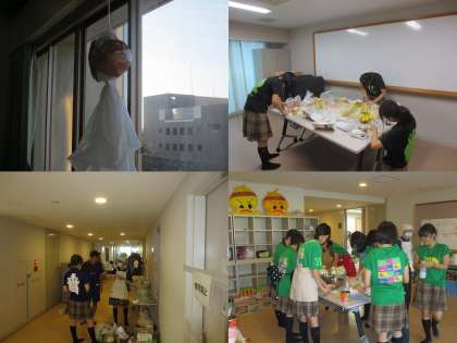 下の写真(1・2枚目)は,8時ごろの模擬店準備の様子です。(左上の写真のみ,教室に吊るされていた「てるてる坊主」です。)3年生全クラスがこの最終日に取り組む,メニューや装飾に「エンタープライジング」な工夫を凝らした模擬店,御期待下さい。