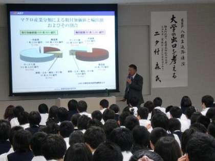 6月3日(木)の第7校時、1年生全員を対象にEEP(Enterprise Education Project)進路講演会を開催しました。入学間もない1年生ですが、いま彼らが直面しているのは、自然科学系コースか社会科学系コースかの選択作業です。この課題解決の一助にでもなればとの思いで独立行政法人産業技術総合研究所(茨城県つくば市)から企画本部の 二タ村 森(フタムラ シゲル)氏を招聘して『大学の出口を考える』の演題の下、講演会を実施していただきました。二タ村先生のご略歴は、次のとおりです。