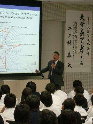 二タ村先生は、経済産業省による早期工学人材育成事業(高校からは堀川高校と本校が参加)の関連で経産省の調整官時代にも本校を来訪していただいております。また、本年3月の東京フィールドワークででも大変にお世話になりました。