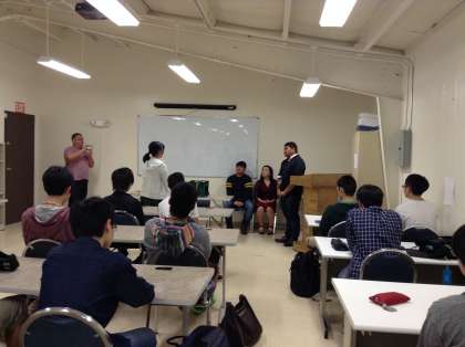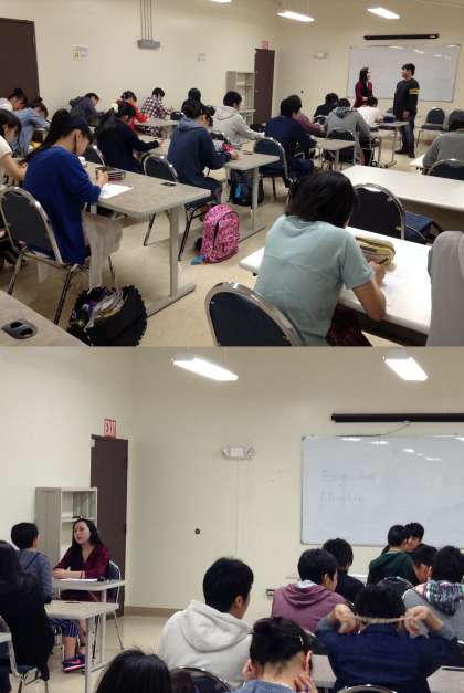 グアム大学では,教室に案内された後,まず最初にグアム大学でのこのプログラムの代表の方やインストラクターの紹介がありました。生徒たちは普段耳にする英語のスピードとの違いに戸惑いながらも,一生懸命聞いて理解しようとしていました。その後,生徒たちは一人ずつ自己紹介をした後,クラス分けのためのエッセイの試験とインタビューテストを受けました。ほとんど寝ていない状態ではありますが,頭をフル回転させて頑張っています!