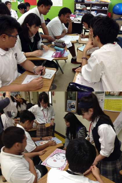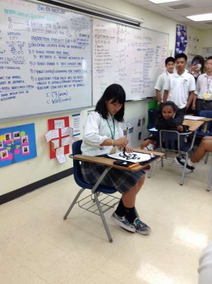 まず2人の生徒がパワーポイントで日本,京都,西京高校について素晴らしいプレゼンテーションをしてくれました。その後,グループに分かれて自己紹介,漢字紹介,折紙,福笑いなどを楽しみました。また,3人の生徒が書道のお手本をデモンストレーションしてくれました。西京高校の生徒からも思わず拍手が起こる素晴らしい出来栄えでした。それを見て,JFK高校の生徒も書道に挑戦,大変上手でした。全員で写真を撮って名残惜しみながらJFK高校をあとにしました。