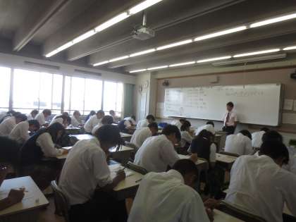 7月末までの「夏季学習講座」(3年生は「夏季進学補習講座」)の後,しばらくは校内や校外での部活動,あるいは学習室での自習や西京祭の準備等で生徒たちの登校する姿が見られていましたが,本日(8月23日[火])久しぶりに全学年揃っての登校日となりました。午前中,学年ごとに英語・数学・国語・理科等の問題に取り組みました。