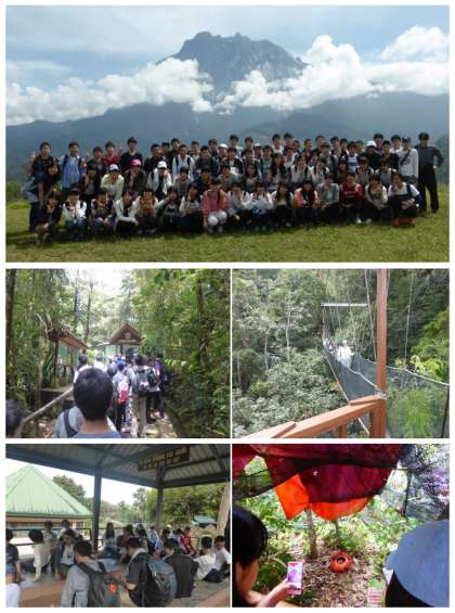 今日は,まずキナバル国立公園で植物園の見学とトレッキングで,マレーシアの植物について学びました。予報に反し天候にも恵まれ,道中,東南アジア最高峰のキナバル山の展望が良い場所で,念願の集合写真を撮影することができました。