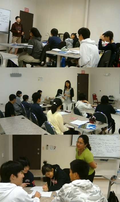生徒たちは多少夜更かしをして(?)疲れた目を擦りつつも,元気に朝食をとって大学へと向かいました。昨日の午後から2コースに分かれての講座が始まっていますが,今日はそれぞれの宿題を発表した後,また新たなアクティビティに挑戦です。西京生同士が英語だけを使ってコミュニケーションをしている姿は,やはりこの環境だからこそですね。