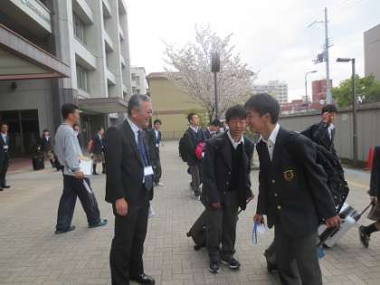右 バスに乗り込む前に竹田校長とあいさつ