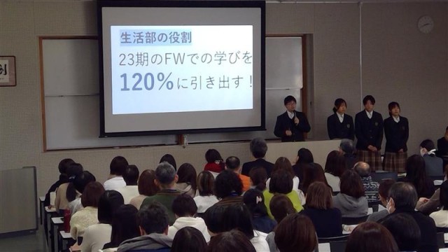 はじめに岩佐校長より、FWについてお話いただきました。FWを生徒の独立自尊を達成する良い機会とするため、保護者の皆様にもご協力いただければと思います。