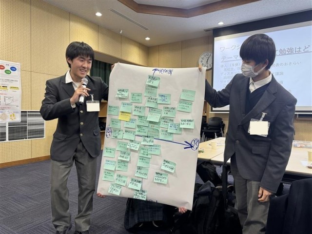 ポスター発表の後には、高校生と大学院生がグループに分かれてワークショップに取り組みました。テーマは「AIによって勉強はどう変わる?」です。生徒たちは大学院生と一緒に意見を出し合い、これからの情報社会についての考察を深めていきました。最後の報告は西京高校と堀川高校の代表が担当し、各グループでどのようなアイデアが出されたのか、また議論の感想などの意見交流を行いました。