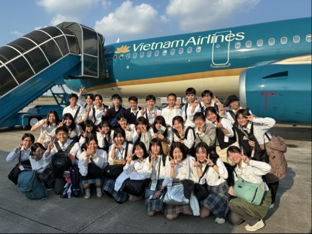写真上:乗り継ぎのホーチミン空港での集合写真