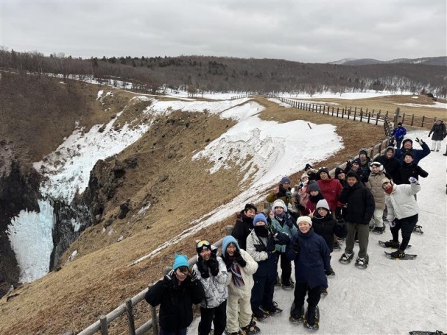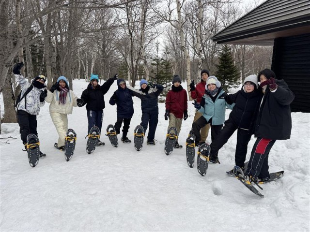 知床の雪の山の中を約2.5kmの道のりを、スノーシューを履いて、知床の自然に関わるガイドを聞きながら約2時間歩きました。人工林や二次林、原生林の木の違いや冬を過ごす動物の生態など、さまざまな方面からの話を聞きながら、目的地のフレペの滝に到着しました。強風が吹く中でその冷たさを感じながら、壮大な自然を目の前にして、感動を覚えているようでした。
