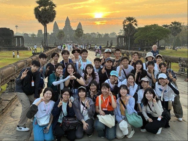 3日目も天候に恵まれており、気温も35度を超える猛暑でした。今日はアンコールワット、アンコールトムなどの遺跡群を巡りました。朝は全員でアンコールワットでの朝日鑑賞を行いました。早くからのスケジュールで大変でしたが、遺跡から昇る朝日の息を呑むような美しい景色に生徒たちもとても感動した様子でした。