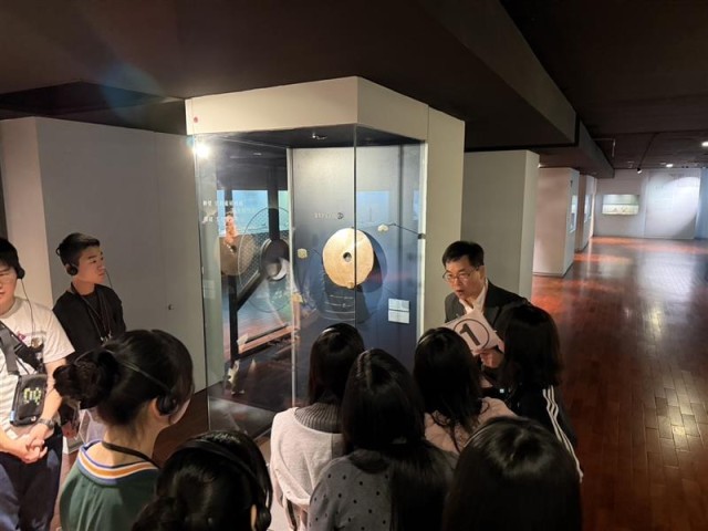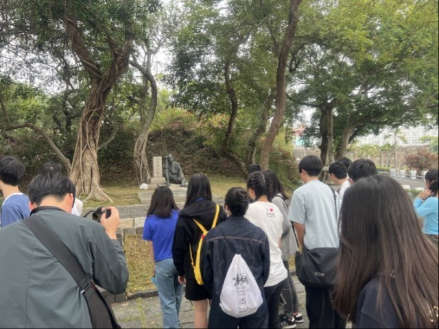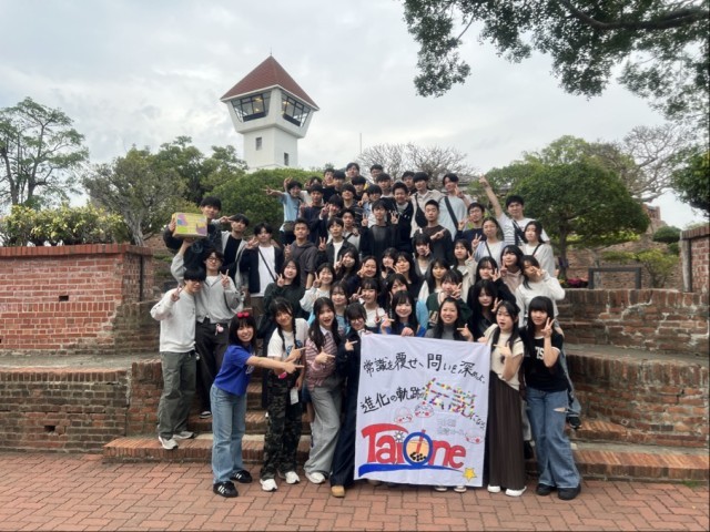 その後、高速鉄道で台南へ移動しました。車内ではこれまでの活動を振り返ったり、景色を眺めながら休息をとったりする様子も見られ、全員無事に台南へ到着しました。台南到着後は渋滞の影響もあり行程を調整し、予定を入れ替えて烏山頭ダムと八田與一記念公園を見学した後、ゼーランディア城を訪れました。八田與一に関する説明に耳を傾け、日本とも関わりの深い歴史について理解を深めていました。