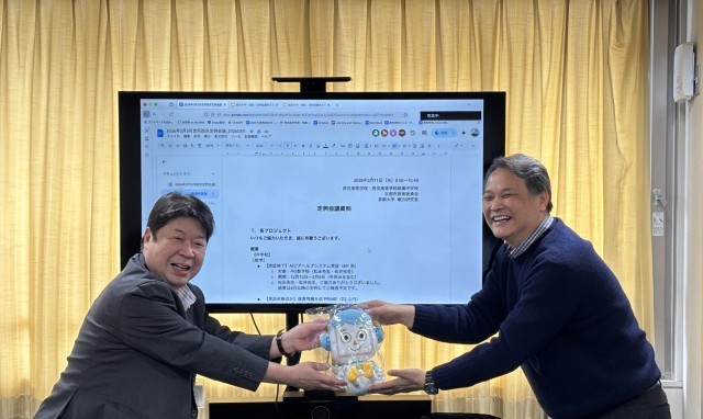 毎月、SIPプログラムに関する定例会議を行っており、本日は今年度最後の定例会議でした。さまざまなプロジェクトの報告が行われた後、緒方教授よりお礼の言葉とAI先生人形をいただきました。