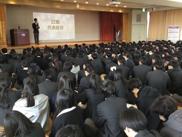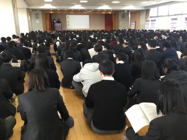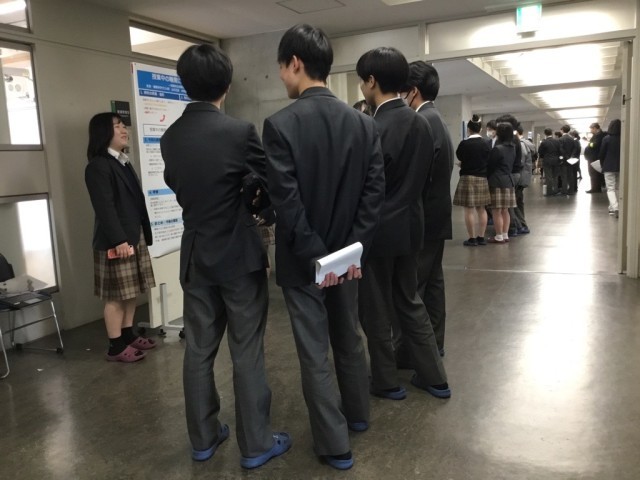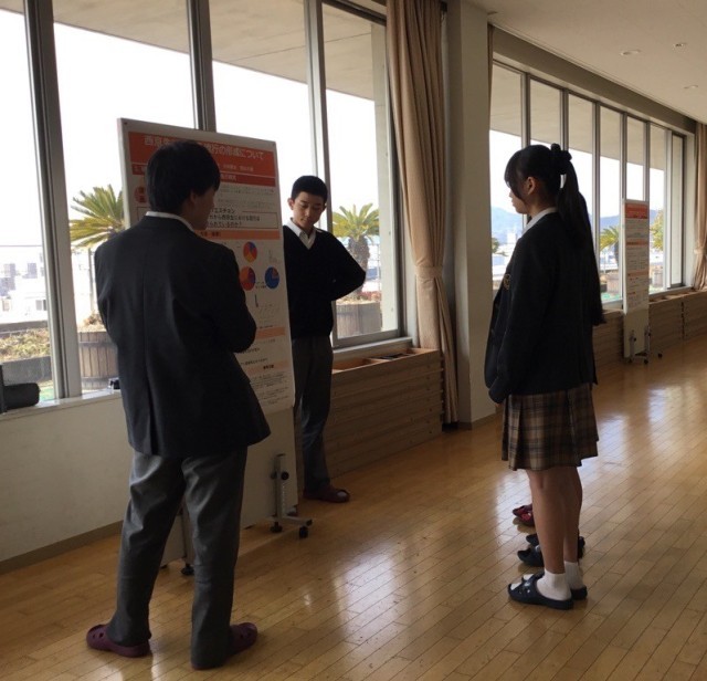 課題研究ポスターセッションは、2年生がEPⅡ(探究学習Ⅱ)で取り組んだ調査活動についてポスター発表し、意見交流することで学びを深めるものとして位置づけられています。開会式では、生徒代表からセッションでのふるまい方についての説明があり、それをふまえ、みなで本番に臨みました。発表者だけでなく聞く側の態度についても言及があり、会場で積極的な質疑応答が交わされていたことを頼もしく思います。