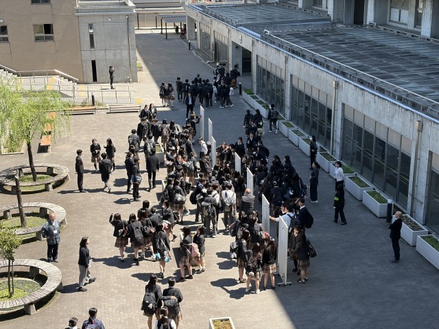 始業式当日、中庭にてクラス発表が行われました。掲示された名簿を前に、生徒たちは期待と緊張が入り混じった表情で自分の名前を探し、新しい仲間との出会いに胸を膨らませていました。