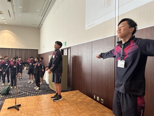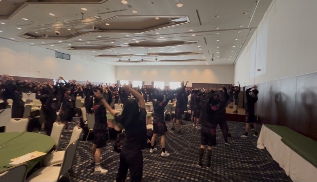 朝、ホールで朝食をとったあと、みんなでラジオ体操をしました。これは学習合宿スタッフ生活部による特別企画です。生徒たちは、「体が固まっていたから伸ばせて気持ちいい」と笑顔を見せていました。今日も一日活動頑張ります。
