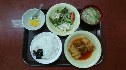 柔らかくボリューム満点。メインのロールキャベツ、野菜サラダ、マカロニポテトサラダ、白飯、えのきだけの味噌汁、デザートにフルーツ寒天がついて440円。ごちそうさまでした。
